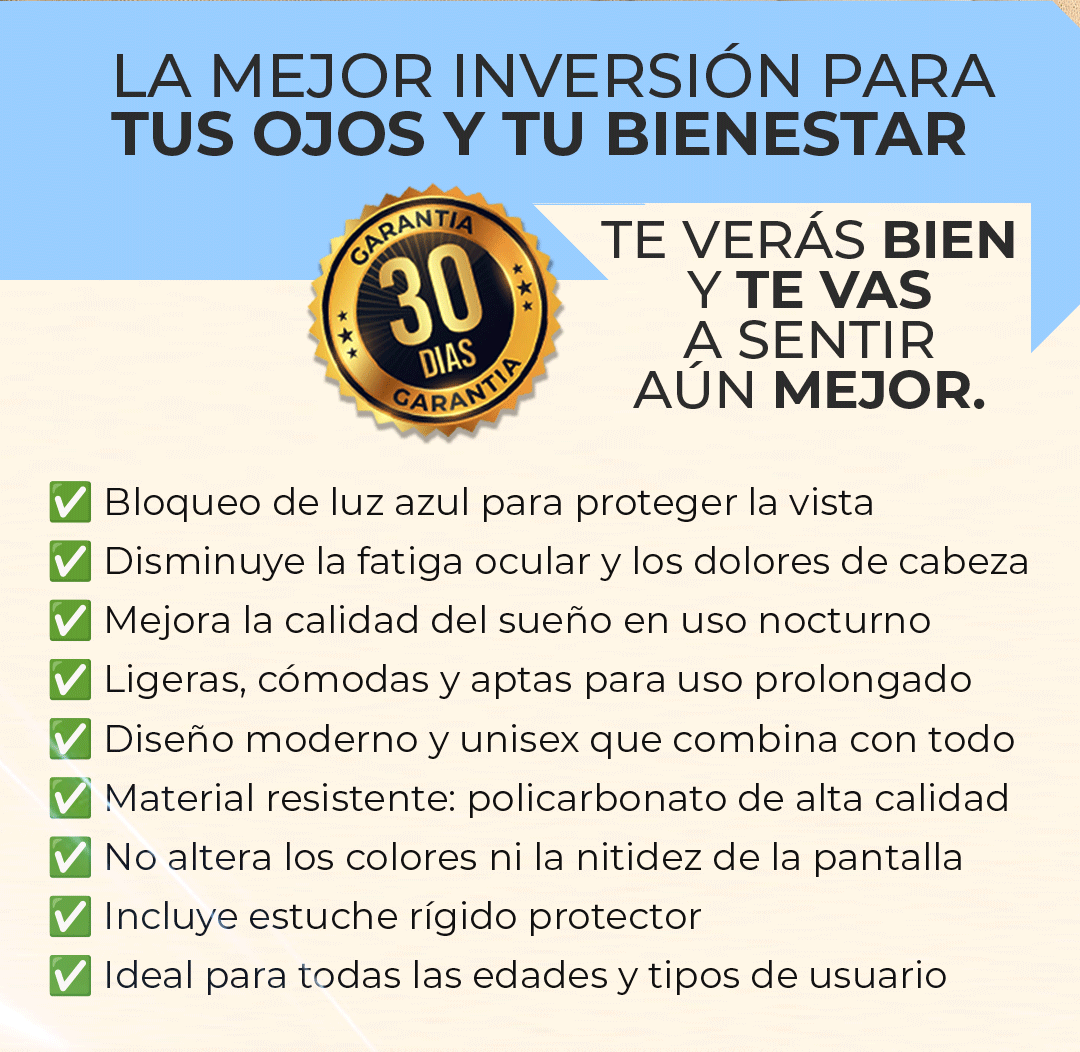 Soy programador y pasaba 10 horas frente a pantallas. Las gafas redujeron mi fatiga visual en pocos días. Excelente inversión.